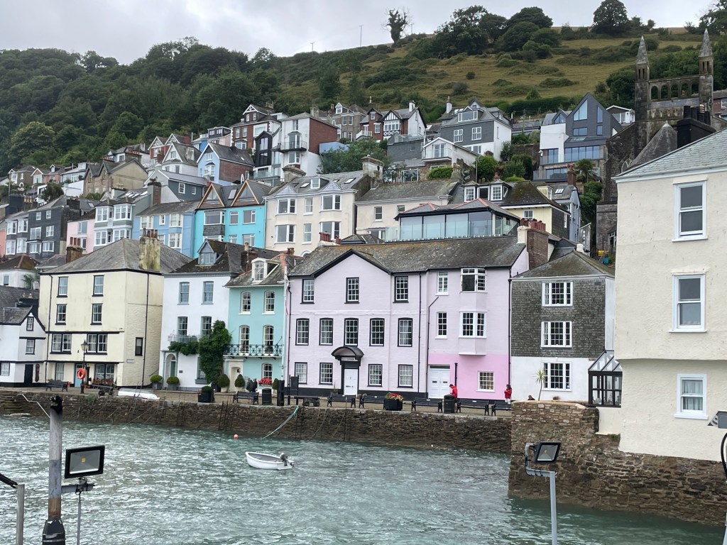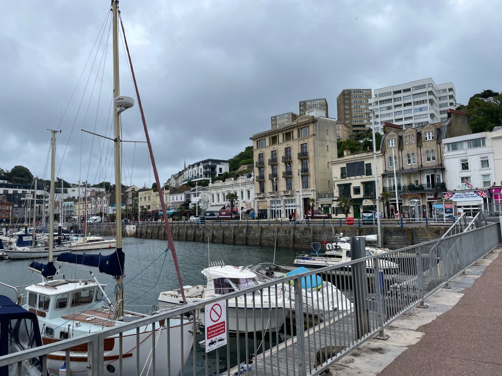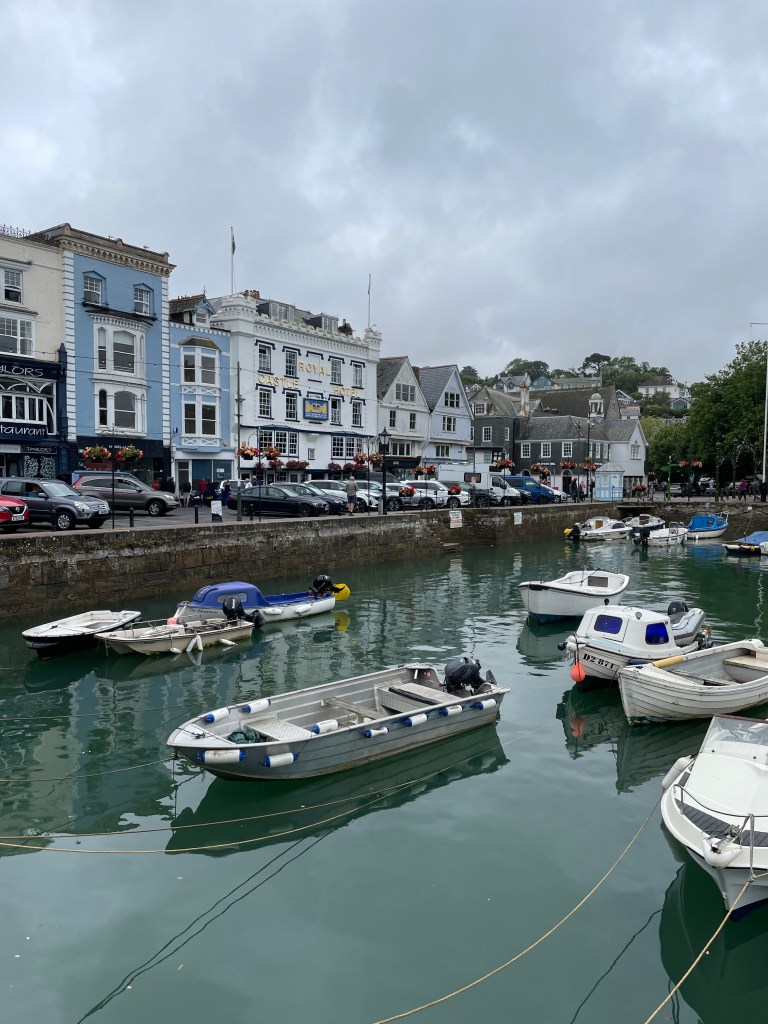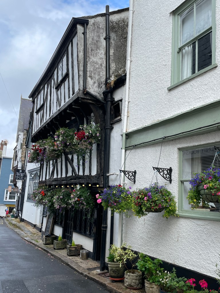 Rested and cleaned up, having had a dose of doggy love, Devon was another star on our list of “must visit” – staying on the outskirts of Torquay we arrived for the British beach summer in full swing with a cool wind and rain. We almost made it through for our first morning of exploration in the semi-dry but then the heavens opened and we were too far away to brave the walk home, into the wind, with just umbrellas, so lined up for the local bus back. Torquay was interesting, a friend said it had a faded elegance, and faded it was. That afternoon we took the car out to explore further afield and found the charming village of Dartmouth. This was much more up our alley, with quirky and wonky buildings and interesting harbour views. We enjoyed wandering these streets as the sun came out again.