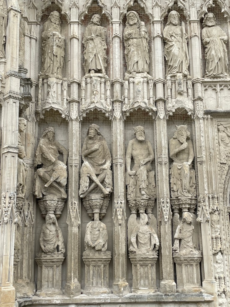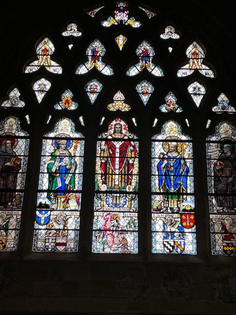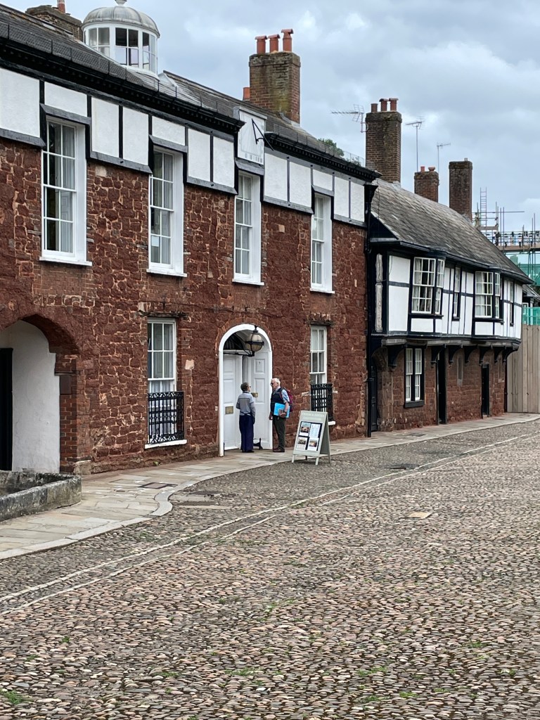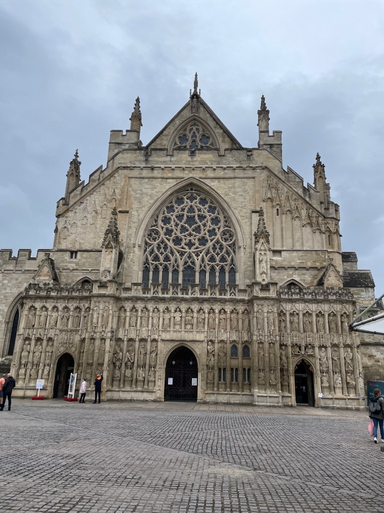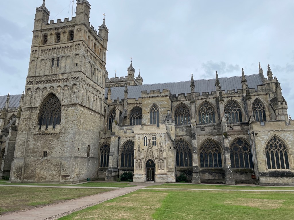 Each month, Chris is supposed to have a blood test to monitor levels due to medication he is on and, this month, we had found a clinic in Exeter so that was our reason to head to this city we knew very little about. It was a pleasant surprise to wander the streets of this ancient city and find out more about its history, viewing city walls and a very old church – two of its towers have survived since the 1300’s, most of the rest since the 1500’s and just a “minor” new repair after WWII. The front facade was quite beautiful and the flying buttresses evident on the length of the building added to its grandeur. There were many old buildings in the main street too, thankfully not with ubiquitous “Costa coffee” signs plastered across them.