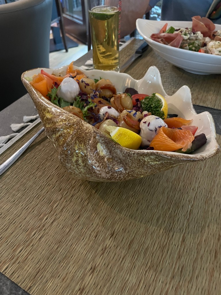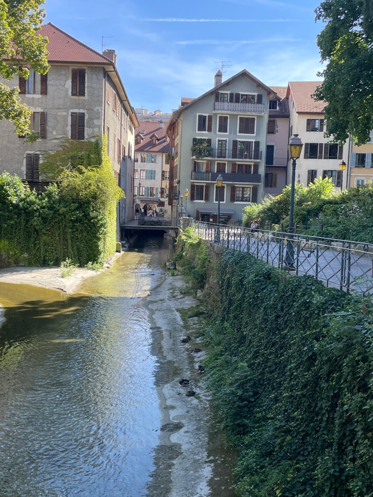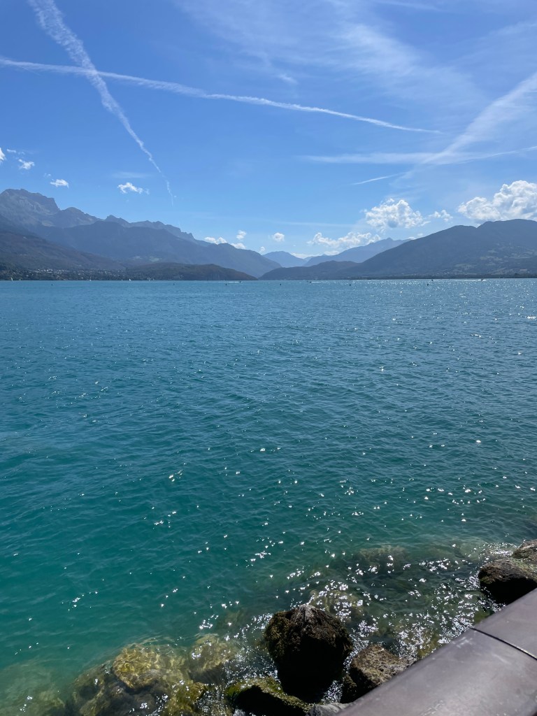 We have been to this region previously and loved Annecy, but staying there was out of budget so we ended up in Aix-les-Bains, 20 minutes further away. Our apartment was huge! High ceilings, beautiful floor to ceiling french doors onto a balcony, chandeliers in the bathroom and ornate decoration, but comfortable for the couple of nights we would be there. Our host had sent us a list of potential cafes that would be open for us after 9pm when we finally arrived; we were happy to drop our bags and wander down to the busy square and enjoy our first night on the European continent, soaking in the atmosphere. French food is amazing – the following night I had the meal of the trip so far, a seafood salad with presentation and flavours to gasp over. The next morning dawned sunny and warm, we headed to Annecy to enjoy this lovely place. Wandering the streets, enjoying the warmth and sunshine, this was the summer we had been waiting for, and it was now September, officially autumn but so much better than the majority of our summer in the UK – temperatures hovered around the mid/high-20’s – warm but not unpleasant and no wind. Chris noticed that my whole demeanour changed and I know I felt the difference in the sunshine. Down at the lakeside, we decided to hire bikes for an hour and do a short ride around part of the lake – it was lovely to be out and about and the views were captivating with the busy lake, blue skies and low mountains in the distance.