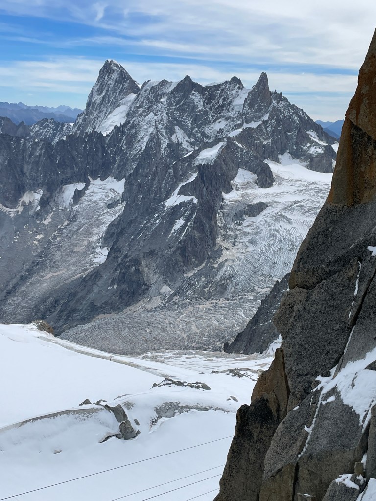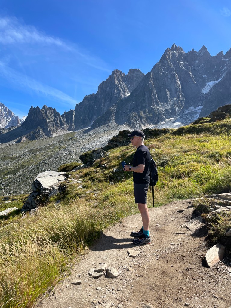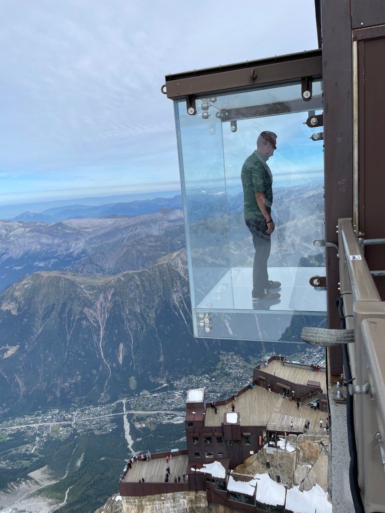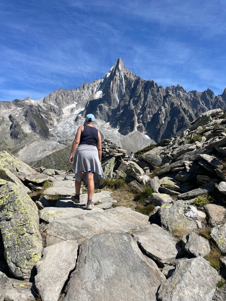 Many years previously, we had visited Chamonix with our teenaged children and taken the ride up to the Aiguille du Midi, and we wanted to repeat it, this time stopping on the way down to walk across the face of the mountains to another stop with a train back to the valley. We remembered that our last trip (in September 2005) had been very chilly at the top, so we packed warm clothes to ensure we were not caught out this time. The gondola to the peak station is breathtakingly steep and you feel like you are heading straight into the cliff as you reach the peak, but the views are just stunning. The peak is higher than New Zealand’s tallest (Mt Cook is 3724m, Aiguille du Midi is 3842m). The views across to the Italian and Swiss alps were beautiful and we enjoyed taking it all in, dressed in our warm jackets and beanies as it was about 6o. Then back to the mid station (temperature 24o) with a rest to eat our lunch before starting the 2 1/2 hour hike across to the Mer de Glace train depot. We were expecting the trail to be similar to the one we had done the previous day, and it started off wide and relatively flat, before becoming much narrower, winding its way up and down, across precarious scree slopes and throwing in a bit of rock climbing as well. It was a much harder hike than we expected and but the views made up for it. There were so many others on the trail too, we knew we weren’t going the wrong way. We stopped several times just to catch our breath, hydrate and take in the views before finally spotting the station were were aiming for – even then it took another half an hour of down hill switchback paths to reach to terminal. We sank thankfully into a couple of seats and savoured cold drinks while chatting to a couple from the US we had met earlier on the Aiguille du Midi. It was a very pleasant way to end our day of adventure and exertion before catching the train down to the valley below and the bustle of Chamonix itself.