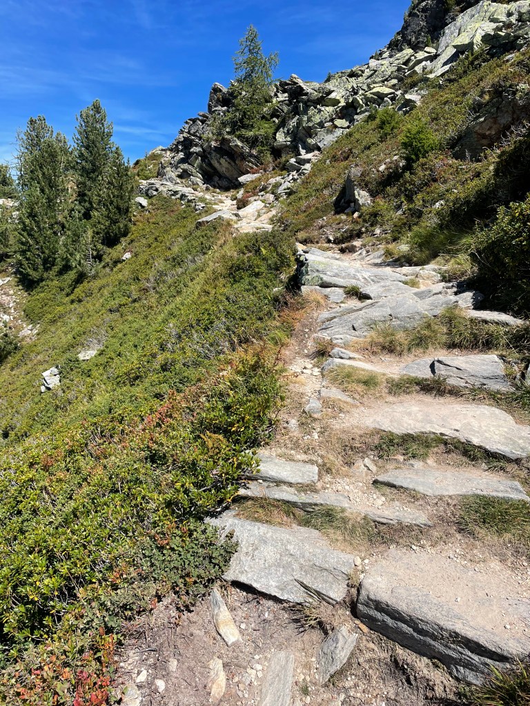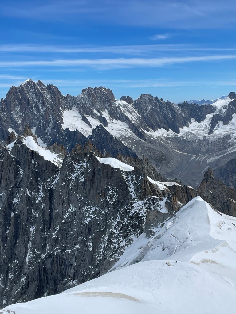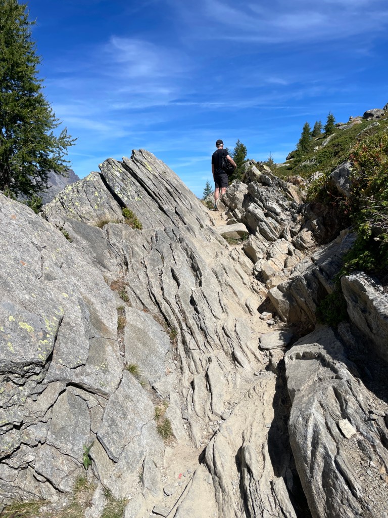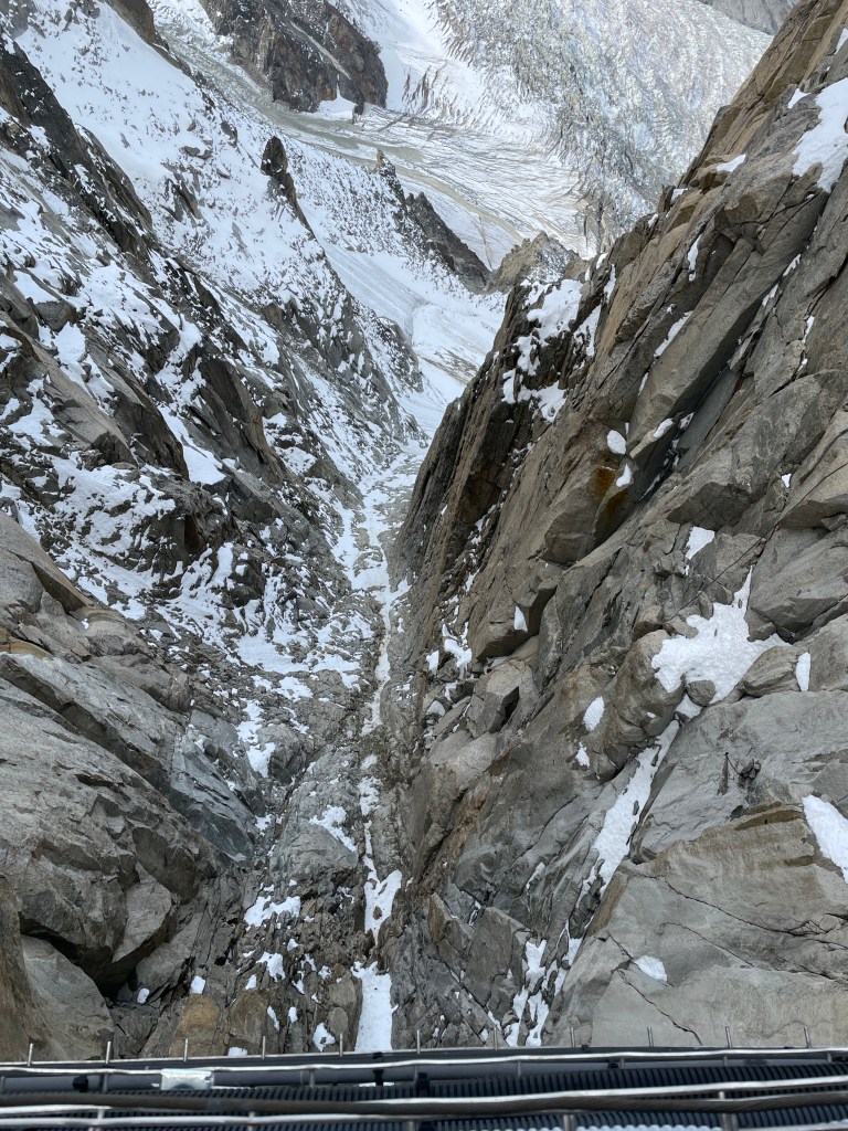 Many years previously, we had visited Chamonix with our teenaged children and taken the ride up to the Aiguille du Midi, and we wanted to repeat it, this time stopping on the way down to walk across the face of the mountains to another stop with a train back to the valley. We remembered that our last trip (in September 2005) had been very chilly at the top, so we packed warm clothes to ensure we were not caught out this time. The gondola to the peak station is breathtakingly steep and you feel like you are heading straight into the cliff as you reach the peak, but the views are just stunning. The peak is higher than New Zealand’s tallest (Mt Cook is 3724m, Aiguille du Midi is 3842m). The views across to the Italian and Swiss alps were beautiful and we enjoyed taking it all in, dressed in our warm jackets and beanies as it was about 6o. Then back to the mid station (temperature 24o) with a rest to eat our lunch before starting the 2 1/2 hour hike across to the Mer de Glace train depot. We were expecting the trail to be similar to the one we had done the previous day, and it started off wide and relatively flat, before becoming much narrower, winding its way up and down, across precarious scree slopes and throwing in a bit of rock climbing as well. It was a much harder hike than we expected and but the views made up for it. There were so many others on the trail too, we knew we weren’t going the wrong way. We stopped several times just to catch our breath, hydrate and take in the views before finally spotting the station were were aiming for – even then it took another half an hour of down hill switchback paths to reach to terminal. We sank thankfully into a couple of seats and savoured cold drinks while chatting to a couple from the US we had met earlier on the Aiguille du Midi. It was a very pleasant way to end our day of adventure and exertion before catching the train down to the valley below and the bustle of Chamonix itself.