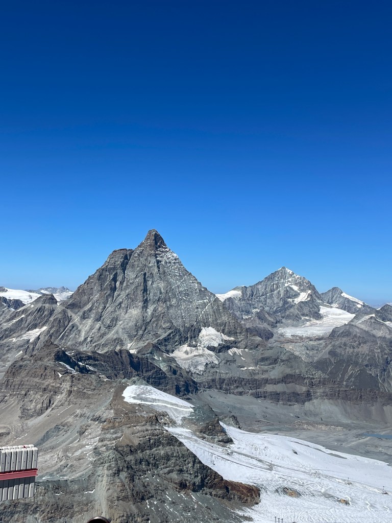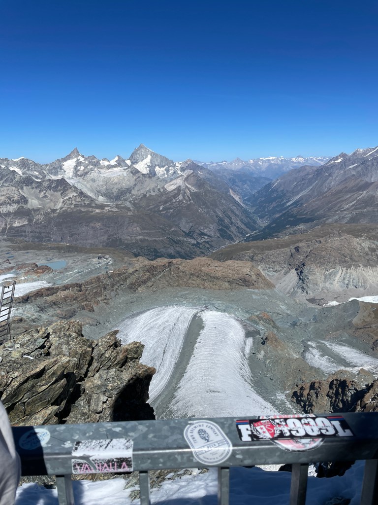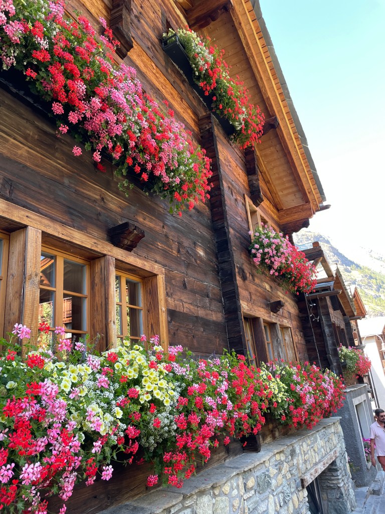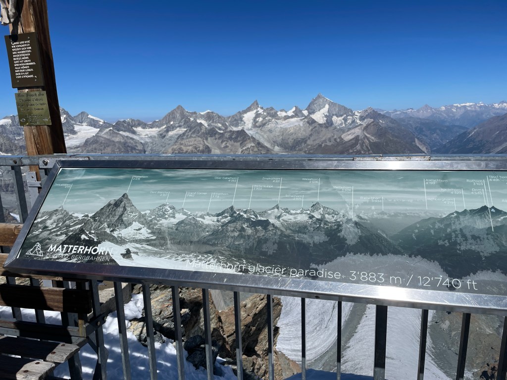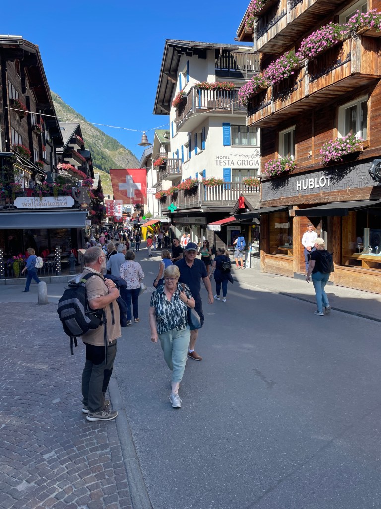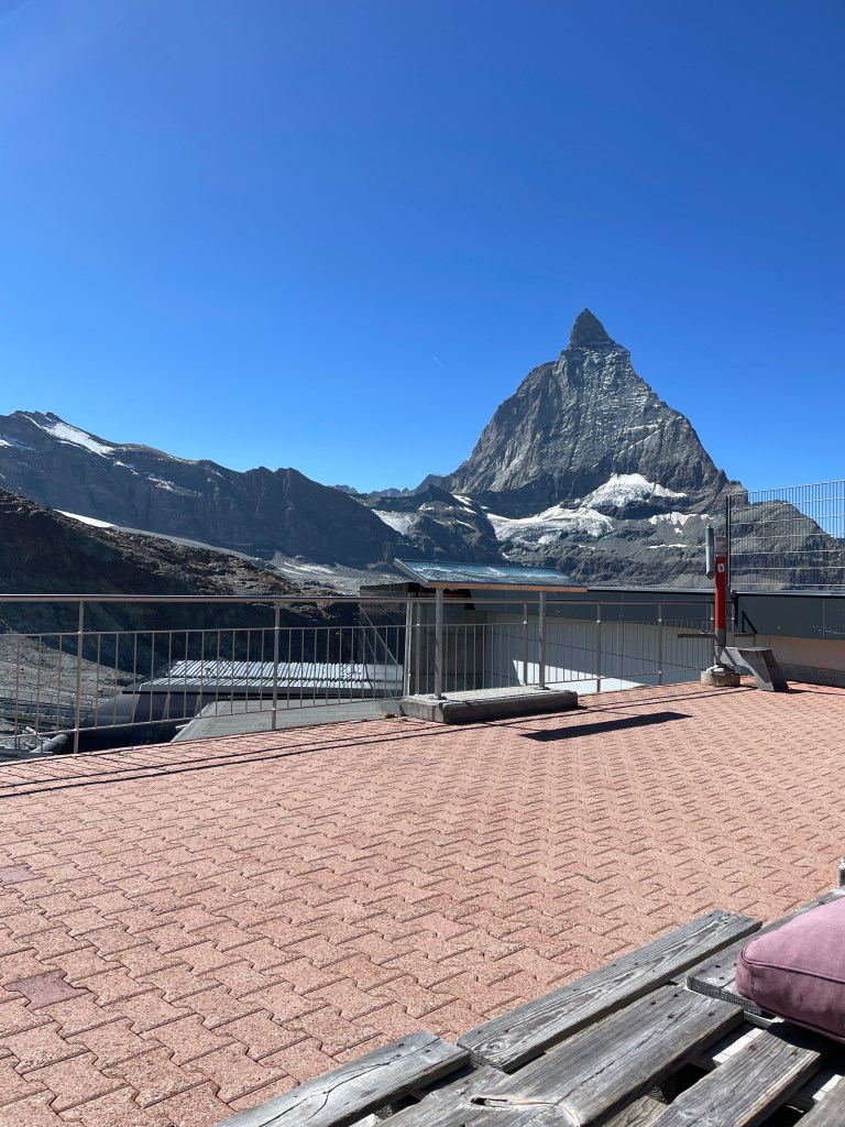 Keeping the mountains theme, we now headed to Zermatt, taking a tunnel train under the alps (a fun experience where you drive onto the train and it takes you through the tunnel, saving an hour of driving). You cannot drive into Zermatt, we had to park at the railway station and take the bags we needed for our overnight stay on a short train ride into the village itself. We checked in to our apartment early and then headed straight for the gondola terminal, buying our expensive, but not mind-blowing, “Matterhorn Paradise” gondola tickets to the summit. The gondola was one of the longest continual rides we’ve done, it kept going up and reaching terminals and continuing on…reaching the top, we were blown away by the stunning views across into Italy – people were skiing the top, and down into Italy. It is the highest gondola in the Alps, at 3883m it was higher again than Aiguille du Midi. The views towards the Matterhorn behind us were amazing, we were so close – and this was all ski-able terrain in winter, how awesome would that be?! It was cool but not cold at the summit, and we spent time taking in these views before discovering more secrets of this area. You wander along a cold ice tunnel under the glacier, and find carved caverns with ice sculptures and even an ice slide between two rooms. We enjoyed this experience, but more was to come as we retraced our ride down to the next stop, where we were able to sunbathe in deck chairs in 24o heat enjoying amazing views of the Matterhorn, and then wandering past icy lakes and snow amongst the glacier moraine. It was worth all we paid and created special memories. Zermatt itself was heaving with tourists – it was supposed to be shoulder season, but there were many tour groups and individual tourists thronging the streets. The town is pretty, and VERY expensive (as was all of Switzerland) so we took advantage of our room having a kitchen, and the supermarket being next door, to eat in, enjoying views off our balcony.