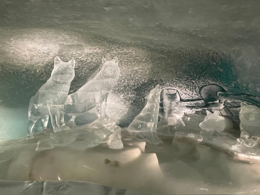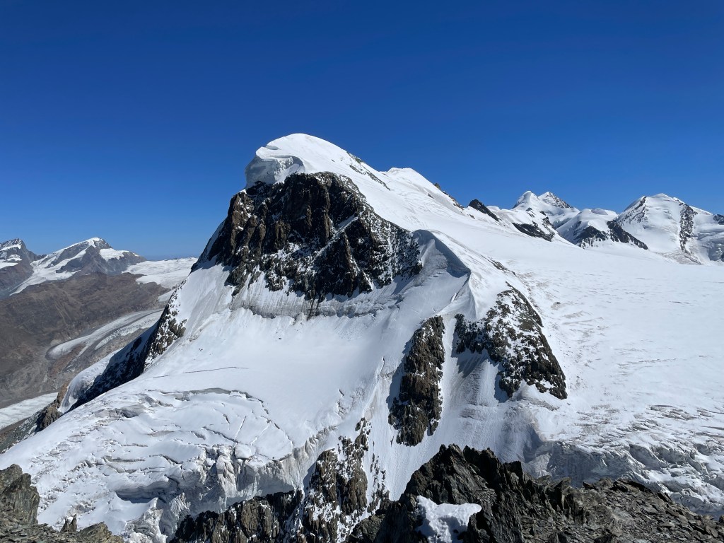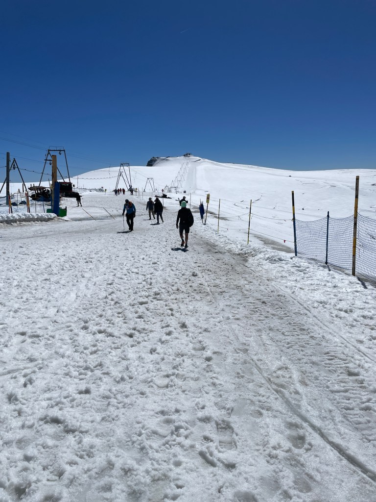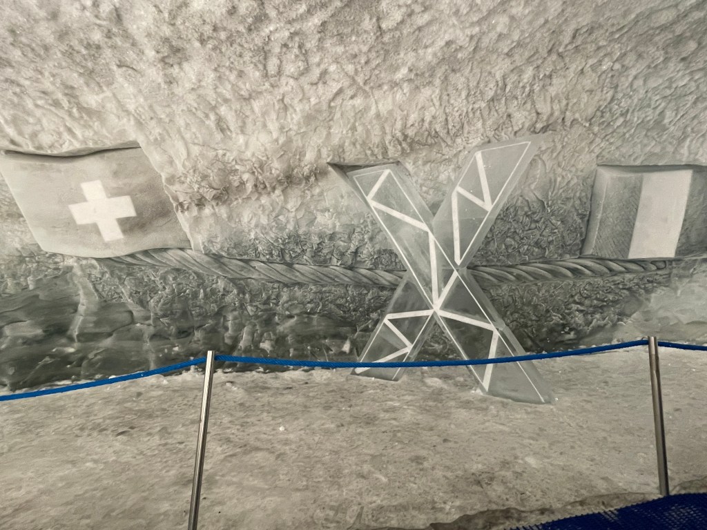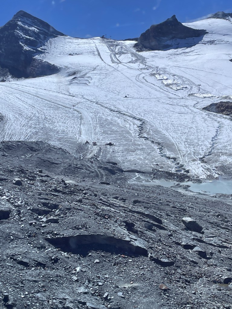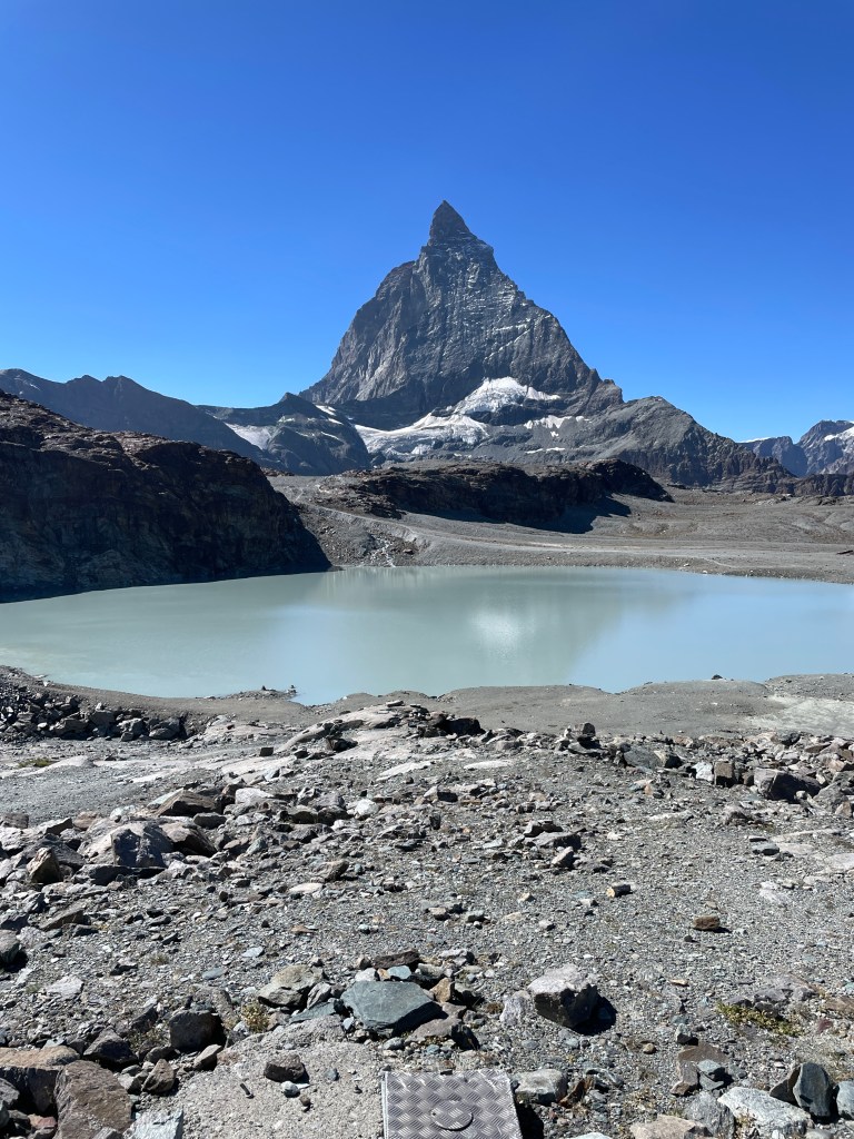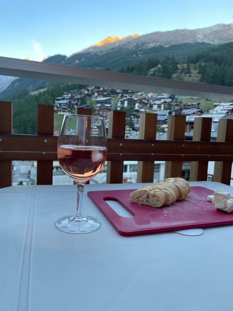 Keeping the mountains theme, we now headed to Zermatt, taking a tunnel train under the alps (a fun experience where you drive onto the train and it takes you through the tunnel, saving an hour of driving). You cannot drive into Zermatt, we had to park at the railway station and take the bags we needed for our overnight stay on a short train ride into the village itself. We checked in to our apartment early and then headed straight for the gondola terminal, buying our expensive, but not mind-blowing, “Matterhorn Paradise” gondola tickets to the summit. The gondola was one of the longest continual rides we’ve done, it kept going up and reaching terminals and continuing on…reaching the top, we were blown away by the stunning views across into Italy – people were skiing the top, and down into Italy. It is the highest gondola in the Alps, at 3883m it was higher again than Aiguille du Midi. The views towards the Matterhorn behind us were amazing, we were so close – and this was all ski-able terrain in winter, how awesome would that be?! It was cool but not cold at the summit, and we spent time taking in these views before discovering more secrets of this area. You wander along a cold ice tunnel under the glacier, and find carved caverns with ice sculptures and even an ice slide between two rooms. We enjoyed this experience, but more was to come as we retraced our ride down to the next stop, where we were able to sunbathe in deck chairs in 24o heat enjoying amazing views of the Matterhorn, and then wandering past icy lakes and snow amongst the glacier moraine. It was worth all we paid and created special memories. Zermatt itself was heaving with tourists – it was supposed to be shoulder season, but there were many tour groups and individual tourists thronging the streets. The town is pretty, and VERY expensive (as was all of Switzerland) so we took advantage of our room having a kitchen, and the supermarket being next door, to eat in, enjoying views off our balcony.