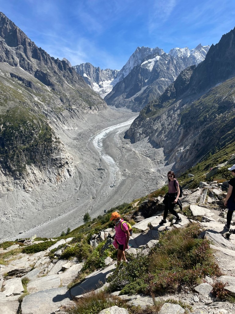 All too soon, it was time to move on towards the mountains. A short drive away was Chamonix, a year round resort with stunning mountains and a characterful town. On the way, we stopped off to do the Tramway de Mt Blanc, a train up to see views of the Chamonix valley and the mountains beyond. The plan was to catch the tram up, walk down to the next stop and tram back down again, eating lunch on the way. The ride was great, climbing higher and exposing more vistas of beautiful valleys and mountains and glimpses of glaciers; the walk down was relatively easy with wide trail and more views, as well as cow bells chiming in the pastures around us. We ended up walking two stops down rather than one as it was so pleasant, It was a very nice afternoon interlude before arriving to our accommodation.