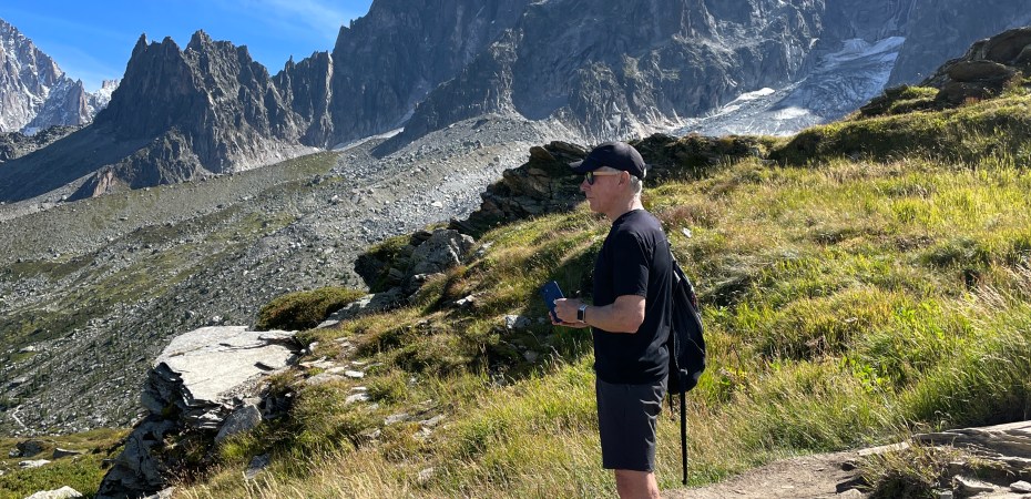 Many years previously, we had visited Chamonix with our teenaged children and taken the ride up to the Aiguille du Midi, and we wanted to repeat it, this time stopping on the way down to walk across the face of the mountains to another stop with a train back to the valley. We remembered that our last trip (in September 2005) had been very chilly at the top, so we packed warm clothes to ensure we were not caught out this time. The gondola to the peak station is breathtakingly steep and you feel like you are heading straight into the cliff as you reach the peak, but the views are just stunning. The peak is higher than New Zealand’s tallest (Mt Cook is 3724m, Aiguille du Midi is 3842m). The views across to the Italian and Swiss alps were beautiful and we enjoyed taking it all in, dressed in our warm jackets and beanies as it was about 6o. Then back to the mid station (temperature 24o) with a rest to eat our lunch before starting the 2 1/2 hour hike across to the Mer de Glace train depot. We were expecting the trail to be similar to the one we had done the previous day, and it started off wide and relatively flat, before becoming much narrower, winding its way up and down, across precarious scree slopes and throwing in a bit of rock climbing as well. It was a much harder hike than we expected and but the views made up for it. There were so many others on the trail too, we knew we weren’t going the wrong way. We stopped several times just to catch our breath, hydrate and take in the views before finally spotting the station were were aiming for – even then it took another half an hour of down hill switchback paths to reach to terminal. We sank thankfully into a couple of seats and savoured cold drinks while chatting to a couple from the US we had met earlier on the Aiguille du Midi. It was a very pleasant way to end our day of adventure and exertion before catching the train down to the valley below and the bustle of Chamonix itself.