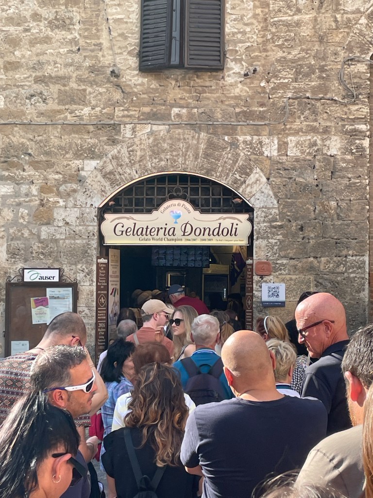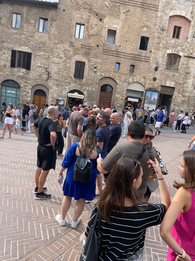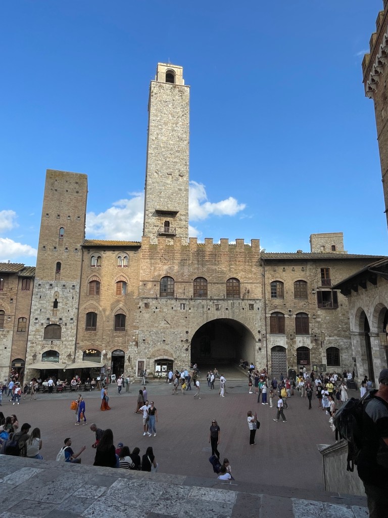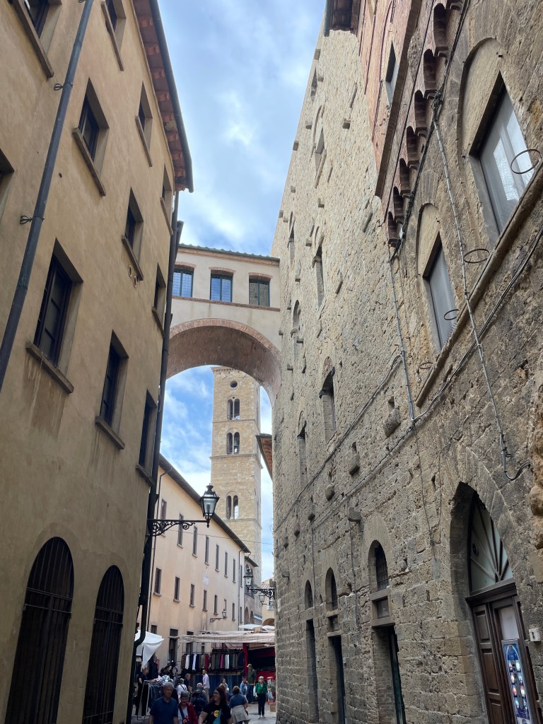 Another day was dedicated to visiting San Gimignano and Volterra, last seen by us over 10 years ago and definitely worth a return trip. San Gimignano was busier than we remembered, it seems to be a theme for us; post C19, tourists are enjoying a longer season for exploring these ancient towns and villages. The world famous gelato shop had a long line of hopeful patrons stretching into the piazza, so I had to join it. It took around 20 minutes to reach the front of the queue, but the gelato was definitely worth it. We took in the sights over the course of the morning, wandering the narrow streets before heading to Volterra, another hilltop village famous for its alabaster as well as stunning views over the countryside beyond. We enjoyed a platter of meats and cheeses for lunch, shaded by umbrella’d seats along one of the many pedestrian streets. It was a good return to these beautiful towns, despite the busy-ness.