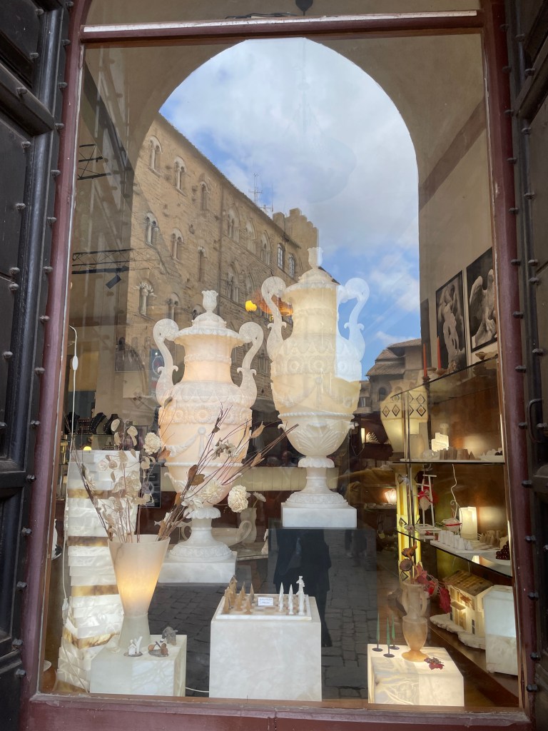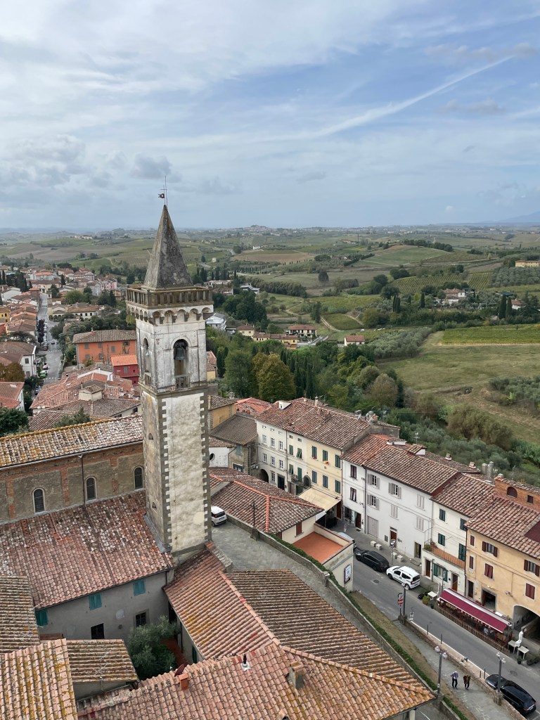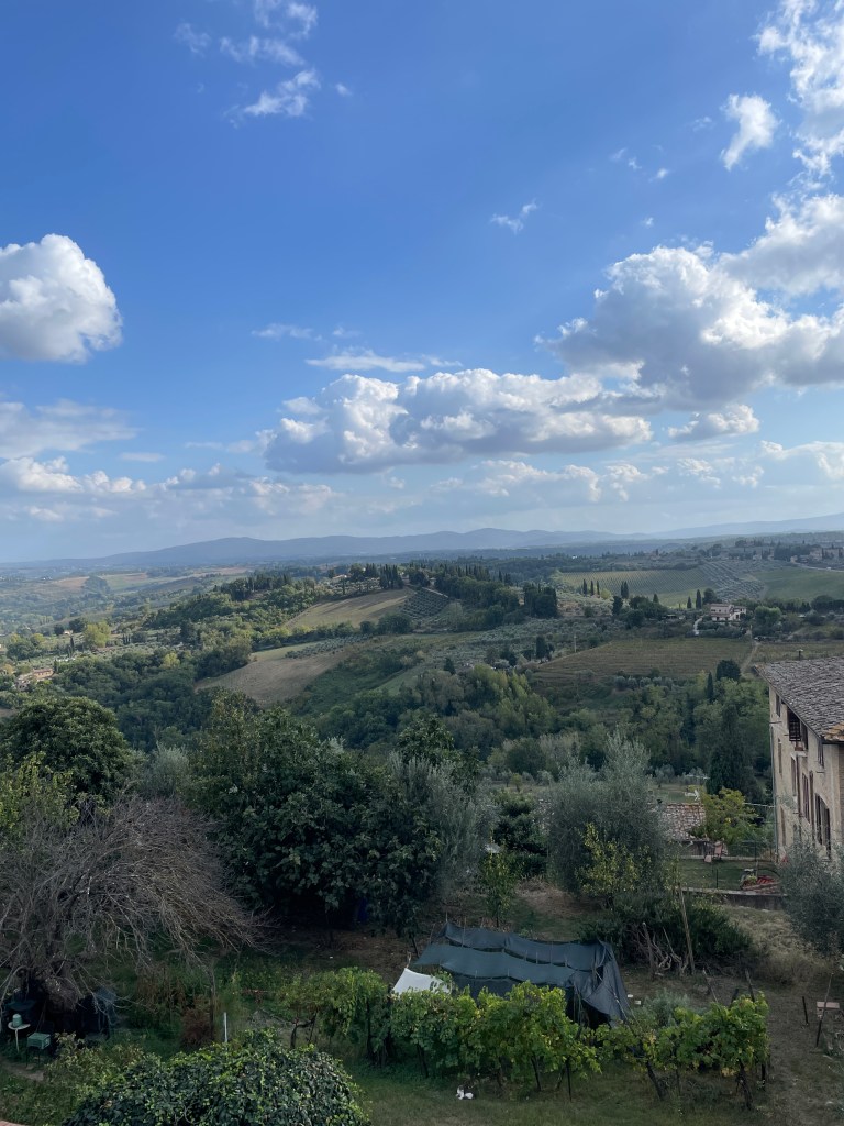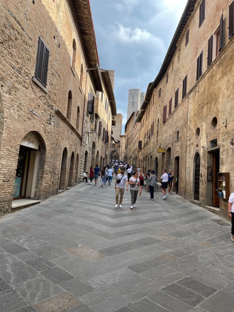 Another day was dedicated to visiting San Gimignano and Volterra, last seen by us over 10 years ago and definitely worth a return trip. San Gimignano was busier than we remembered, it seems to be a theme for us; post C19, tourists are enjoying a longer season for exploring these ancient towns and villages. The world famous gelato shop had a long line of hopeful patrons stretching into the piazza, so I had to join it. It took around 20 minutes to reach the front of the queue, but the gelato was definitely worth it. We took in the sights over the course of the morning, wandering the narrow streets before heading to Volterra, another hilltop village famous for its alabaster as well as stunning views over the countryside beyond. We enjoyed a platter of meats and cheeses for lunch, shaded by umbrella’d seats along one of the many pedestrian streets. It was a good return to these beautiful towns, despite the busy-ness.