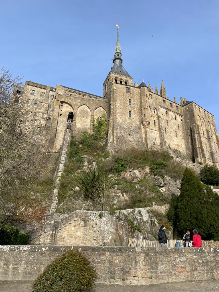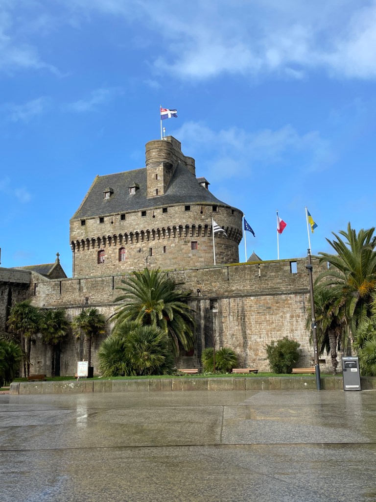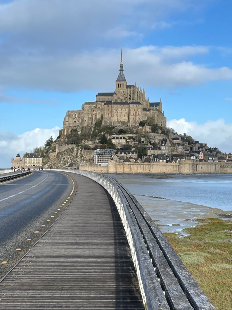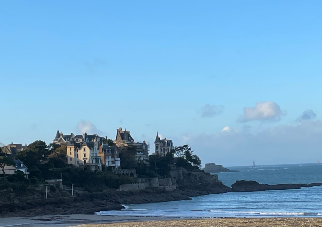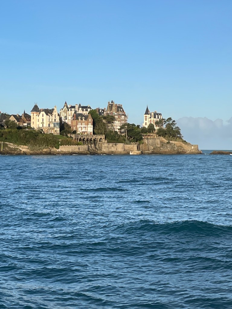 Having seen many photos and posts on social media about the beautiful Mont Saint Michel, we knew we had to make the effort to head to this amazing island before we left Europe. Our housesit location set us up well to travel north, via Le Mans for a rainy coffee stop and leg stretch, and then – because we were so close – I suggested we must try and find Chateau de la Motte Husson, featured in that wonderful series “Escape to the Chateau” with Dick and Angel. We knew it was closed to visitors, but having watched it transform over many series, to see it in its finished state intrigued me. We stopped at the gates to view this renovated chateau, take a couple of photos and grab a free postcard left by the owners, and wonderfully, Dick arrived after doing the school run with their kids and stopped for a chat. We passed on greetings on behalf of NZ and took a couple of additional photos we hadn’t expected to. It was only a short detour, but it had us buzzing for the next stage as we headed north to Dinard, on the coast looking over the estuary towards Saint Malo. Being off season, we had scored an amazing apartment stay overlooking the bay, at a very good price (staying in the peak summer season would have been 4 times the price we paid) for our four night stay. We were looking forward to exploring the pretty and historic area of northern France and this was an excellent base for us.
