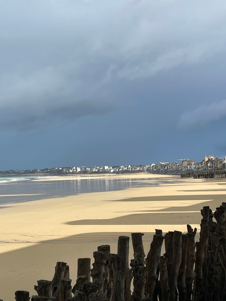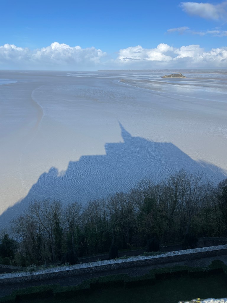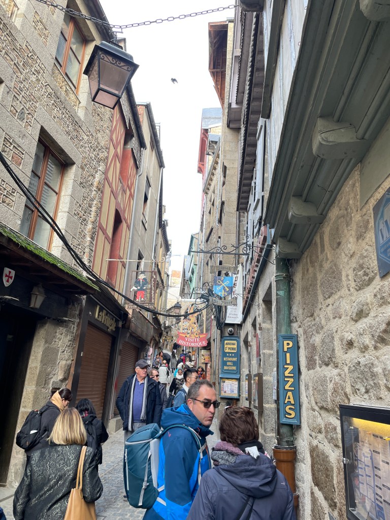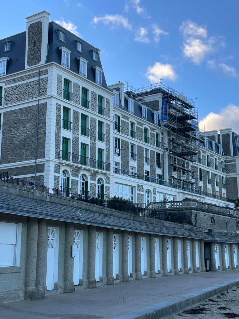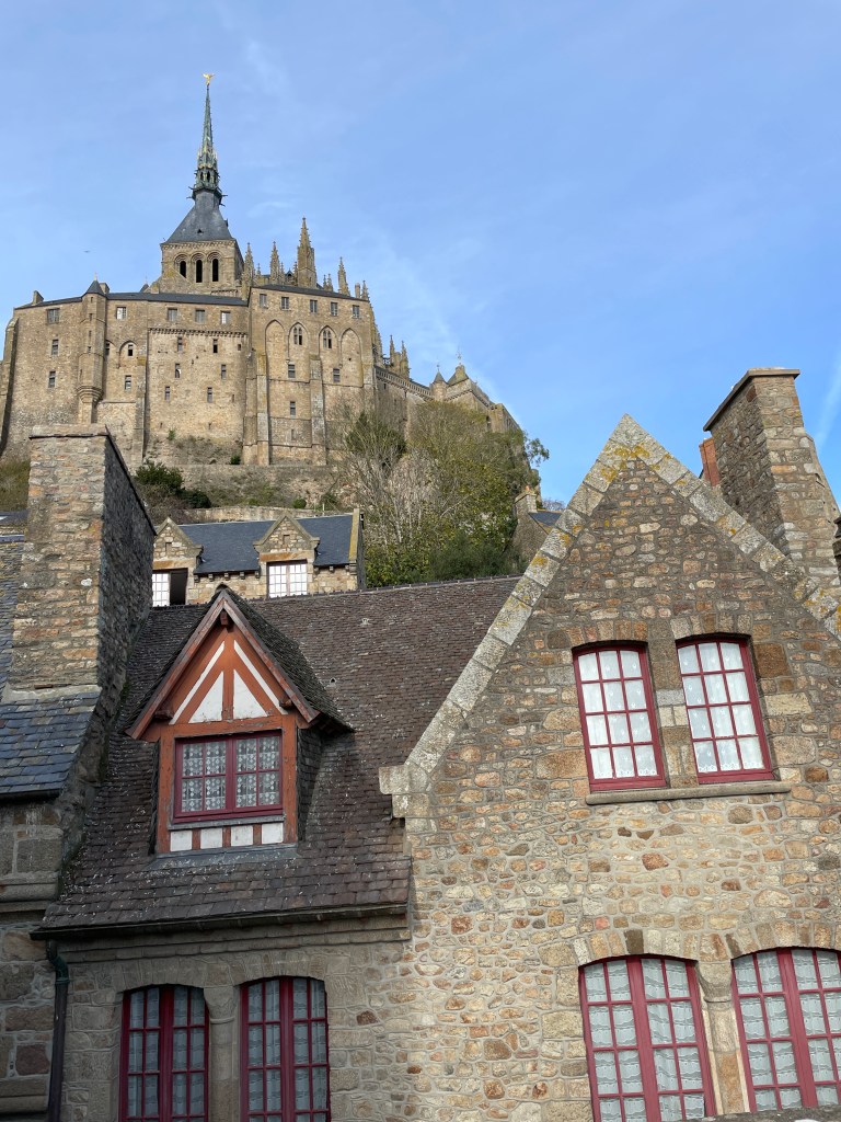 Having seen many photos and posts on social media about the beautiful Mont Saint Michel, we knew we had to make the effort to head to this amazing island before we left Europe. Our housesit location set us up well to travel north, via Le Mans for a rainy coffee stop and leg stretch, and then – because we were so close – I suggested we must try and find Chateau de la Motte Husson, featured in that wonderful series “Escape to the Chateau” with Dick and Angel. We knew it was closed to visitors, but having watched it transform over many series, to see it in its finished state intrigued me. We stopped at the gates to view this renovated chateau, take a couple of photos and grab a free postcard left by the owners, and wonderfully, Dick arrived after doing the school run with their kids and stopped for a chat. We passed on greetings on behalf of NZ and took a couple of additional photos we hadn’t expected to. It was only a short detour, but it had us buzzing for the next stage as we headed north to Dinard, on the coast looking over the estuary towards Saint Malo. Being off season, we had scored an amazing apartment stay overlooking the bay, at a very good price (staying in the peak summer season would have been 4 times the price we paid) for our four night stay. We were looking forward to exploring the pretty and historic area of northern France and this was an excellent base for us.