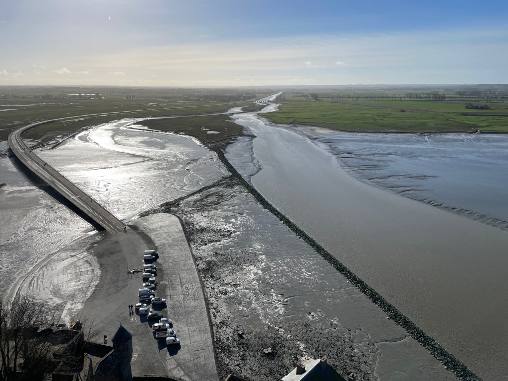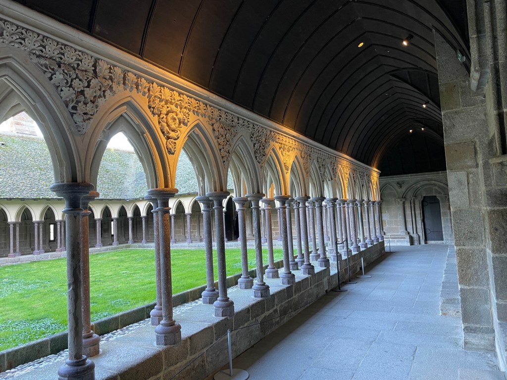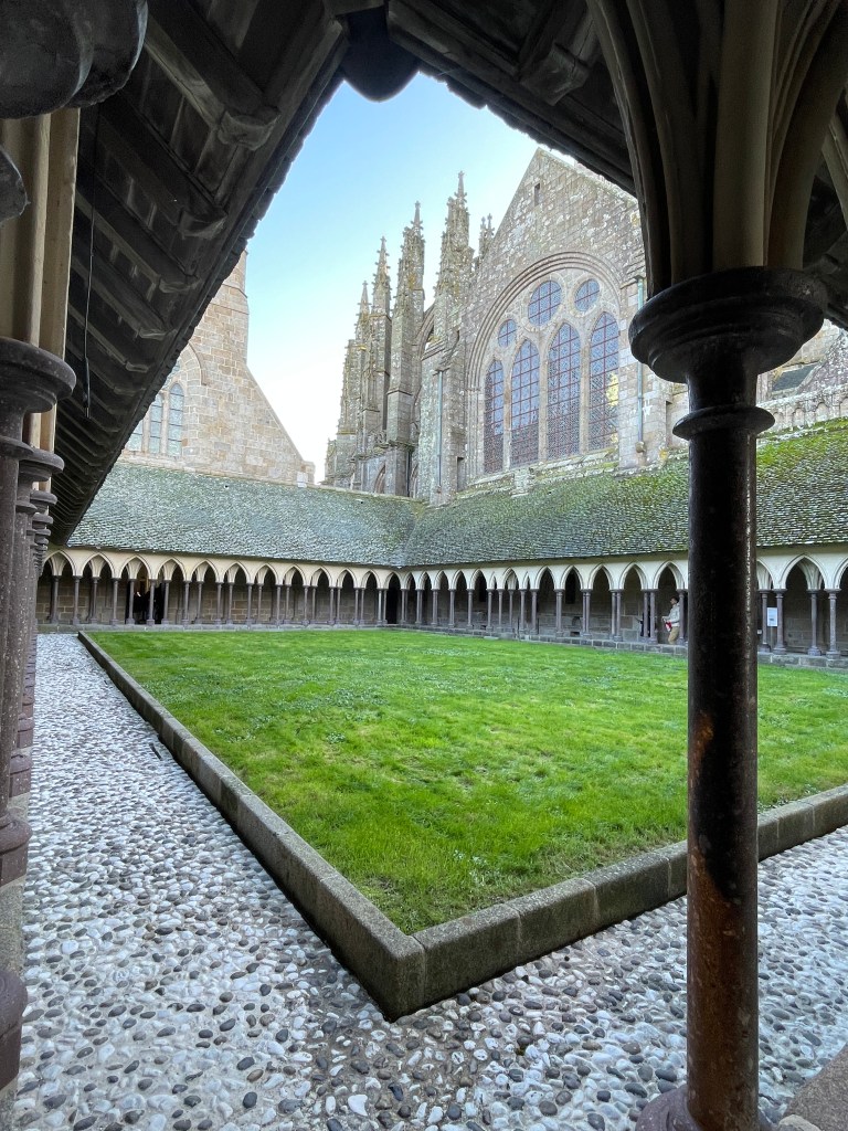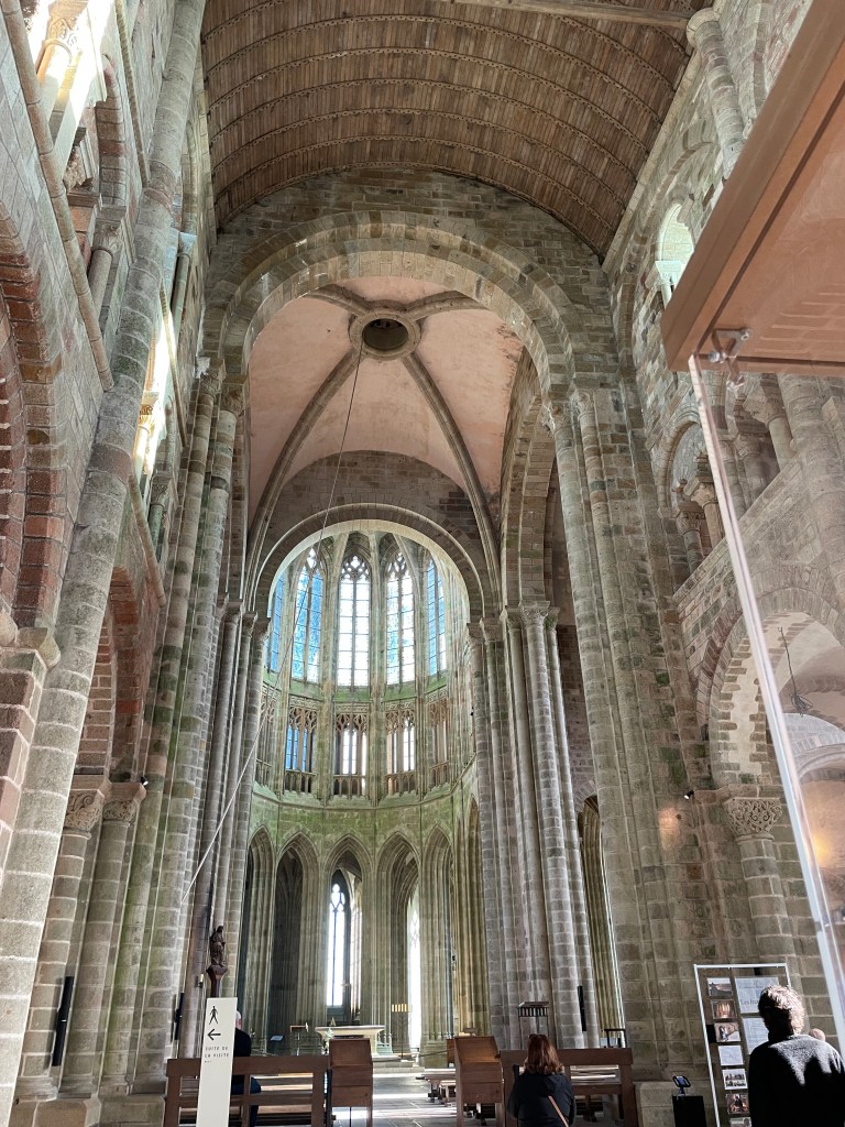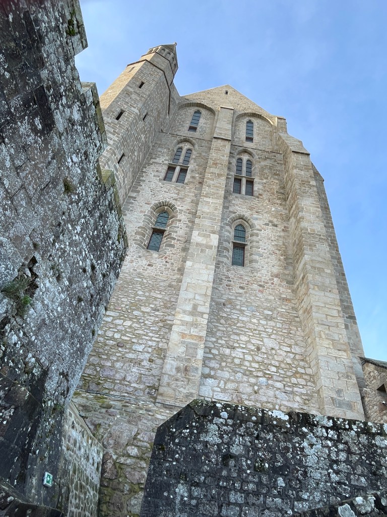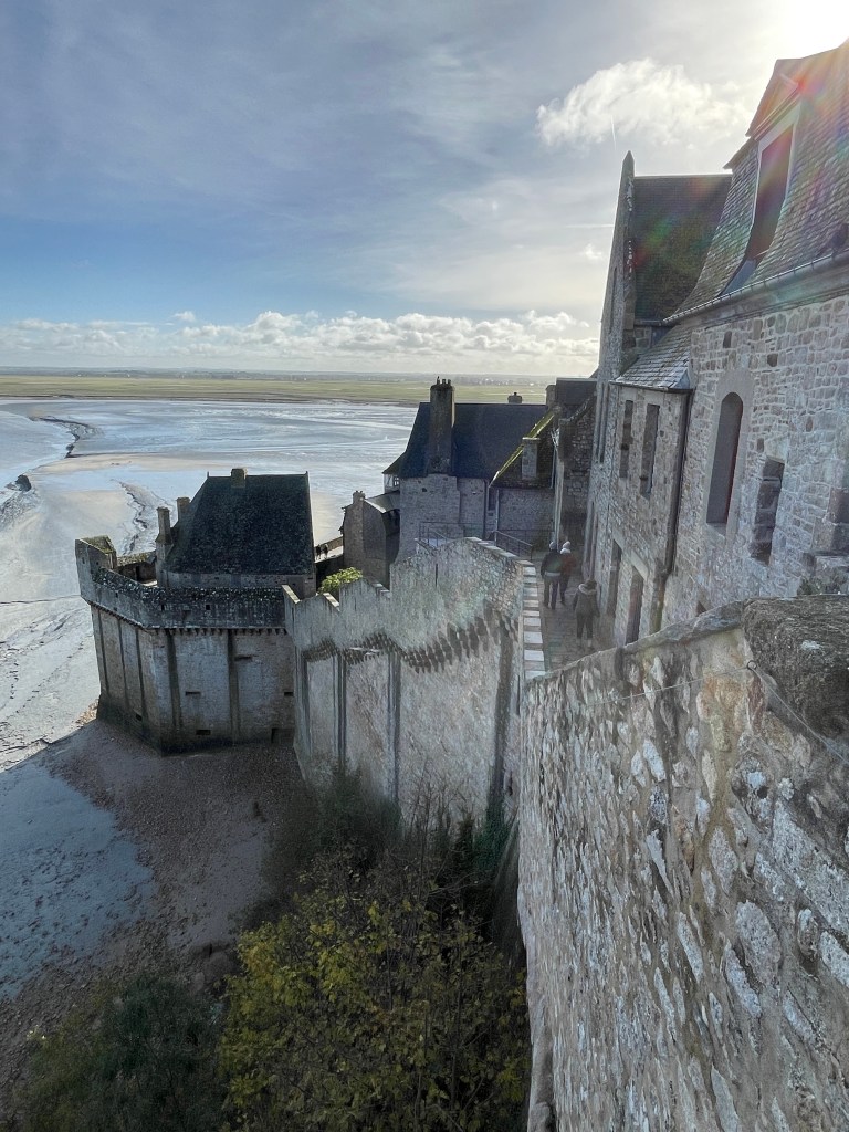 There was so much to see and explore here, but our main focus was to visit Mont St Michel further along the coast. We set off early to drive and park in the nearby town, walking over the causeway to this stunning landmark. Dating from the 11th Century, this monastery, church and the village that has evolved around it has been well preserved and was definitely worth the visit. There was so much to see – climbing through the narrow streets towards to monastery, avoiding the touristic shops and other slow tourists, we climbed up and entered the chapels and cloisters at the top, allowing us great views across the estuary and of the town below. There is still a small community of monks and nuns living here, worshiping in this glorious and once secluded Abbey. We spent a good few hours wandering and taking in the sights, but avoiding spending any extra $ to eat or drink in overpriced cafes, preferring to wait until we had crossed the causeway again (this time in a bus after all the walking and climbing!).